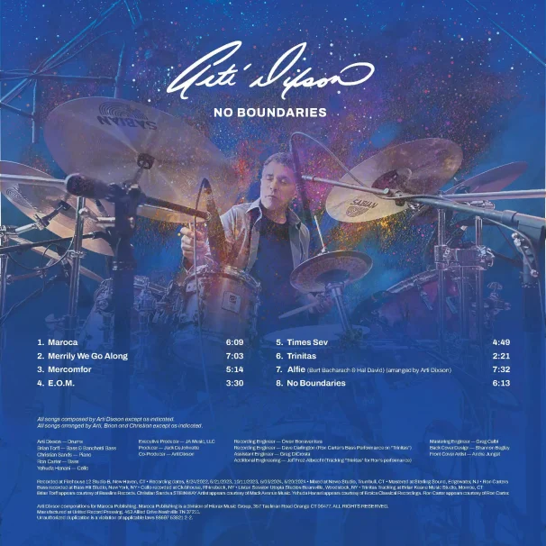 “No Boundaries” is a groundbreaking recording project produced by legendary jazz drummer Jack DeJohnette and featuring an all-star lineup: drummer Arti Dixson, bassist Ron Carter, pianist Christian Sands, bassist Brian Torff, and cellist Yehuda Hanani. Blending the sophistication of classical music with the soul of jazz, the album transcends genre lines, offering a unique and richly textured listening experience. Mastered by Grammy-winning engineer Greg Calbi at Sterling Sound, No Boundaries captures an exceptional moment in musical collaboration.